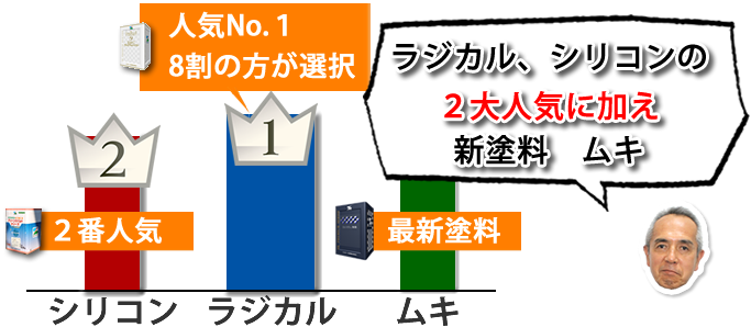 現在は、ラジカルとシリコンで人気を分けるかたちとなっていますが、最新塗料ムキの登場により今後の勢力図がどう変わるか楽しみです。